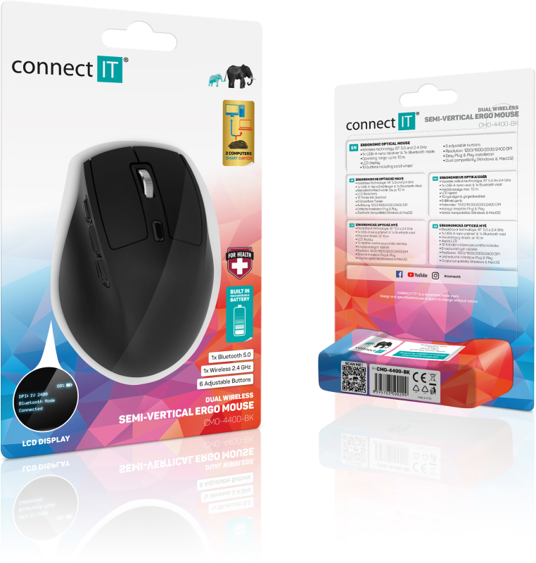 Moderní bezdrátová ergonomie s LCD displejem a DualMode připojením. Myš CMO-4400-BK je navržena pro pohodlné a zdravé používání doma i v kanceláři. Díky duálnímu režimu ji připojíte ke dvěma zařízením najednou, zatímco LCD displej zobrazuje aktuální nastavení v reálném čase.