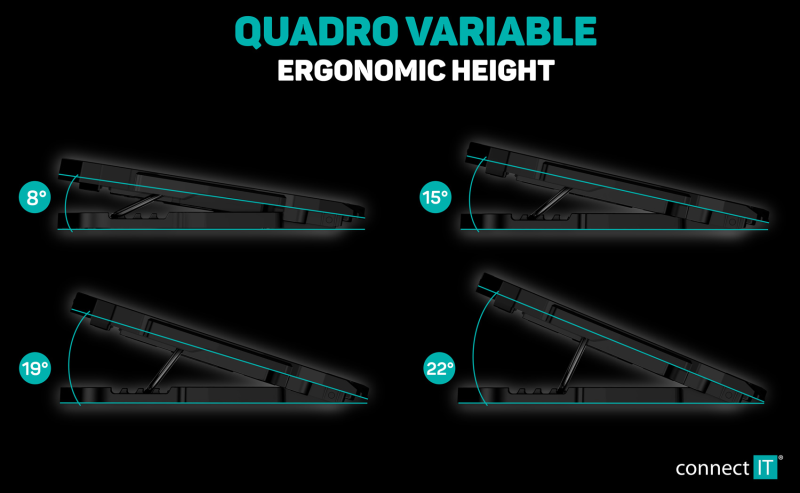 Podložka využívá čtyři ventilátory s nastavitelnou intenzitou, které zajišťují optimální proudění vzduchu pod notebookem a jeho chlazení i při náročném provozu. Cirkulace chladného vzduchu pomáhá chránit komponenty a stabilizovat výkon zařízení.