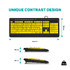 Výrazné barvy, snadné psaní a pohodlí pro každého. Tato kontrastní klávesnice je ideální volbou pro uživatele s horším zrakem, seniory, děti nebo kohokoli, kdo ocení větší písmo a jasné odlišení kláves. Žluté popisky na černém podkladu zajišťují maximální čitelnost za jakýchkoliv světelných podmínek.