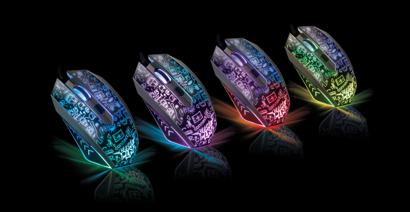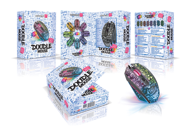 Celé tělo myši je pokryto grafickým motivem DOODLE, přes který prosvítá plynule se měnící vícebarevné podsvícení. Díky tomu působí myš nejen stylově, ale i unikátně a hravě, a hodí se tak k herním sestavám, notebookům i jako designový doplněk pracovního stolu.