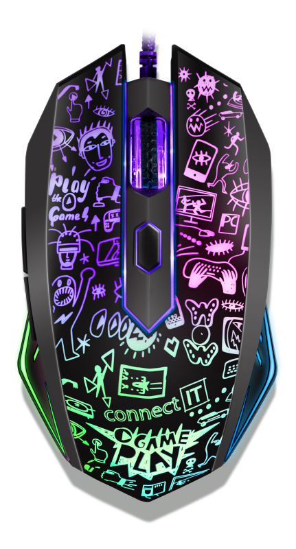 Stylová herní myš Connect IT DOODLE CI-1143 s plynule se měnícím LED podsvícením, ergonomickým tvarem a DPI až 2000 je ideální pro hráče i do kanceláře. Soft-touch povrch zabraňuje pocení ruky, zatímco 6 tlačítek a přesné snímání zajistí maximální kontrol