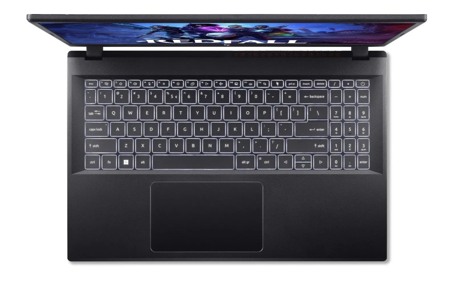 Design Nitro V 15 je robustní a moderní s RGB podsvícenou klávesnicí, která umožňuje vlastní nastavení barev a herních profilů. Ergonomický design klávesnice a přesný touchpad přispívají k pohodlí při delším hraní nebo práci.