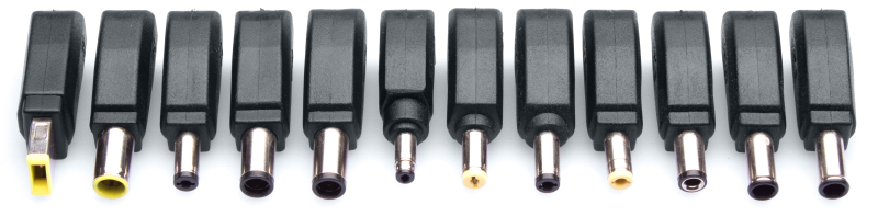 Univerzální konektory pokrývají různé typy napájecích vstupů – například 6,5/4,4 mm, 5,5/2,5 mm, 4,8/1,7 mm, 7,4/5,0 mm a další. Díky tomu je adaptér použitelný pro různé modely napříč značkami bez omezení.