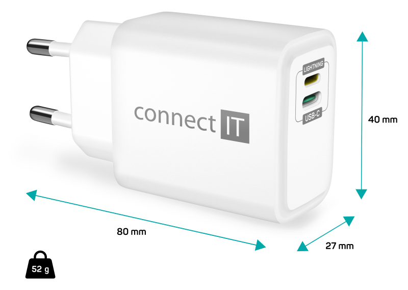 Connect IT Duplex Nabíjecí adaptér 1× Lightning + 1× USB-C, 20W, kabel 27W – bílá