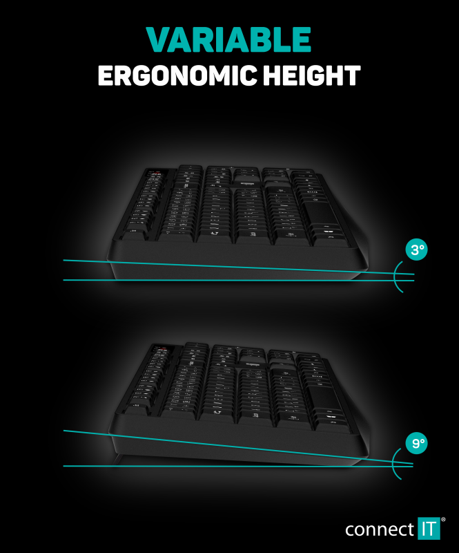 Praktická bezdrátová sada pro každodenní práci. Stylový set Connect IT OfficeBase Wireless Combo v černé barvě spojuje pohodlí a funkčnost. Klávesnice s nízkým profilem a 12 multimediálními klávesami doplňuje ergonomická myš s přesným snímáním a rozlišením 1000 DPI.