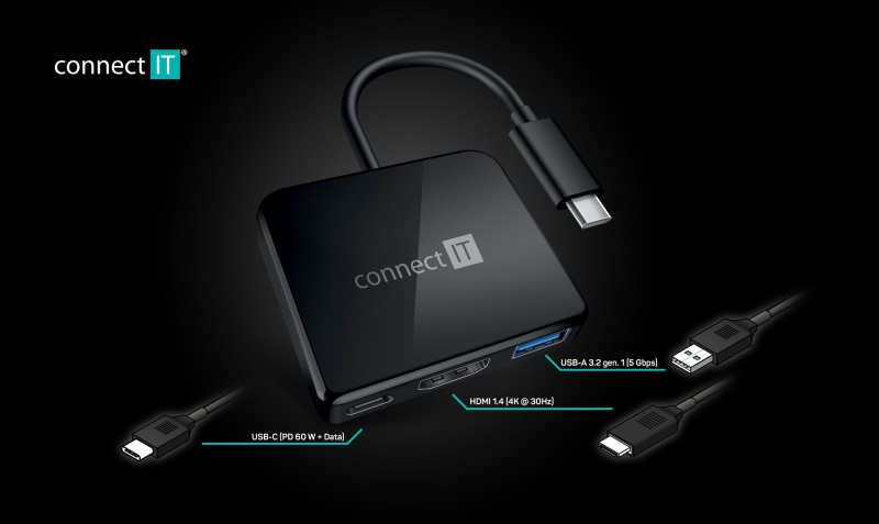 Connect IT USB-C hub, 3v1 (USB-C, USB-A, HDMI) – černá