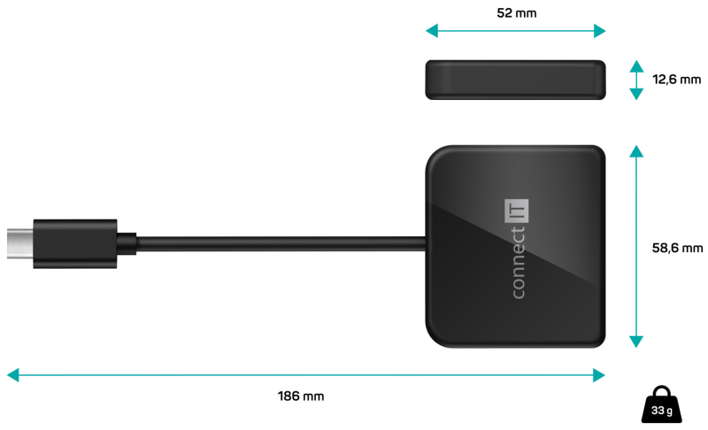 - Rozměry: 58,6 × 52 × 12,6 mm (bez kabelu)